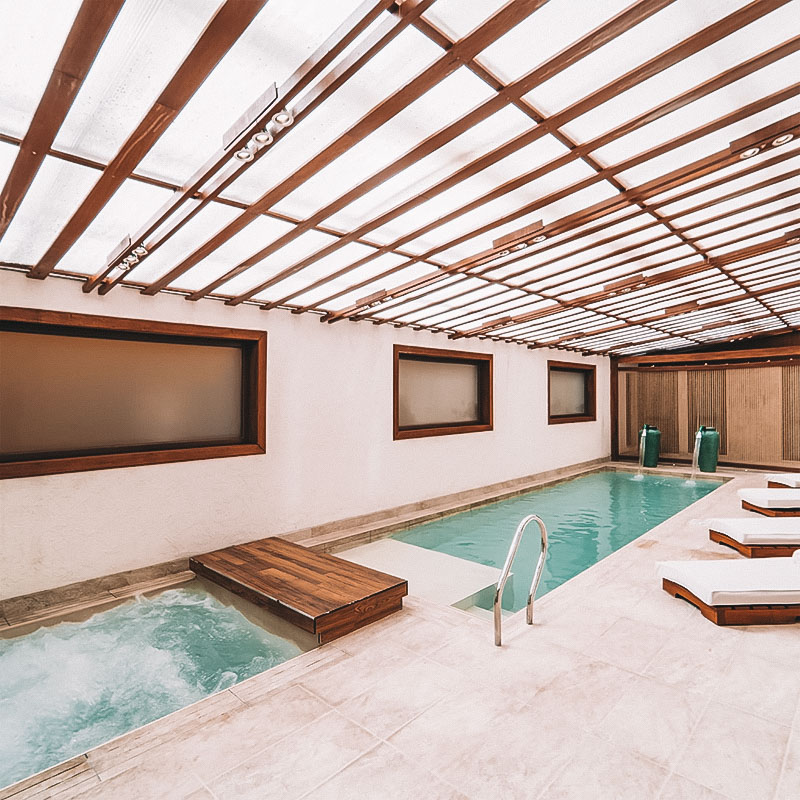 O hotel conta com academia, SPA, terraço e piscina, além de restaurante com culinária variada e música ao vivo. O café da manhã inclui especialidades locais, sucos, queijos e frutas.