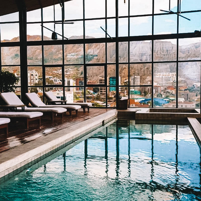 Cinco-estrelas, tem design descolado com obras do artista boliviano Gastón Ugalde e um terraço com piscina e paredes envidraçadas (da capa deste post). Ele fica na sofisticada Zona Sul, perto de bons restaurantes e galerias.