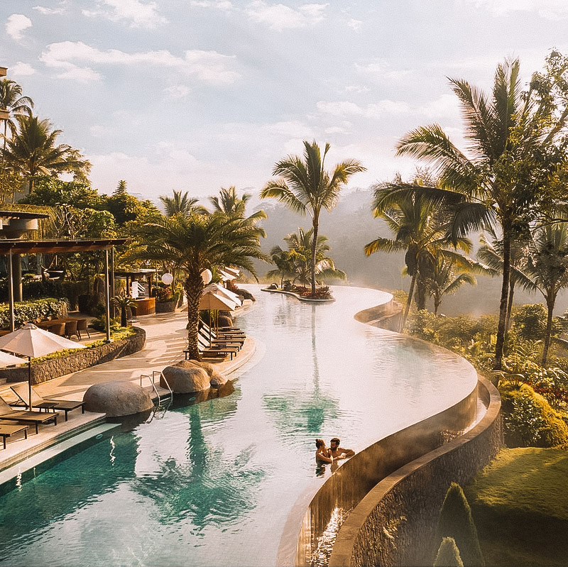 O hotel Kamandalu Ubud é um verdadeiro oásis de tranquilidade e beleza – o resort cinco-estrelas conta com diversas opções de vilas, ideal para famílias e casais em lua de mel, por ter experiências românticas incríveis a dois. A menos de dez minutos do centrinho de Ubud, no Kamandalu você estará isolado e completamente imerso na natureza vibrante que envolve o hotel, um dos mais tradicionais de Bali. Desde 1992 com seu conceito de vila tradicional, conta com acomodações de luxo rodeadas pelos terraços de arroz. Quando o assunto é experiências, o Kamandalu se destaca. Um momento marcante entre os hóspedes é o brunchdentro do barquinho no riacho que corta o hotel, onde as centenas de carpas são as protagonistas da cena. Além de desfrutar de algumas mini entradinhas oferecidas pelo restaurante e tomar alguns drinks, você pode jogar comida para os peixes, deixando o cenário perfeito para fotos legais. Obs: ao todo são três restaurantes no resort.
