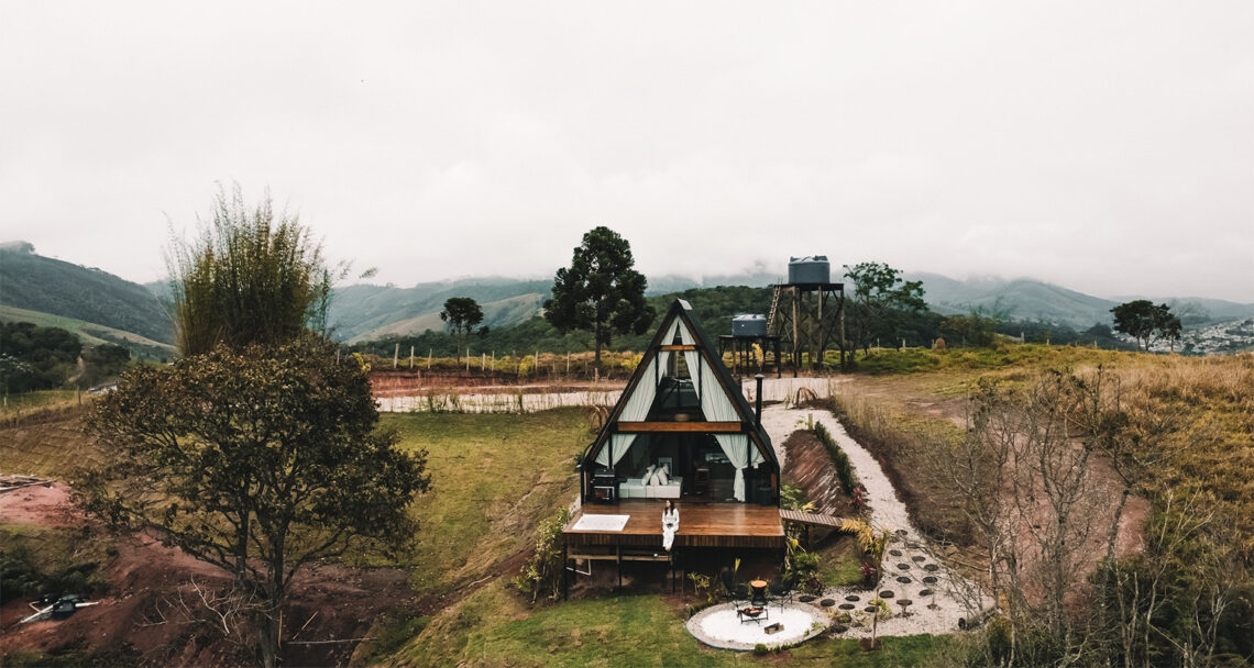 Com 150 m², a cabana é um refúgio contemporâneo e com arquitetura moderna que oferece uma verdadeira imersão na natureza da Serra Fluminense, em Petrópolis. Rodeada pela vegetação do Brejal, sua estrutura envidraçada valoriza a paisagem ao redor, com área externa com rede suspensa, churrasqueira e firepit. Os espaços amplos e integrados, como o deck de 60 m² com ofurô aquecido, a rede suspensa a cinco metros do chão e a área gourmet, criam um ambiente de sossego, ideal para apreciar cada detalhe do entorno. E mais: oferece um jardim, horta, além de uma árvore que atravessa o chão e o teto, conectando o interior à copa das árvores da serra. Diárias a partir de R$ 1 800.