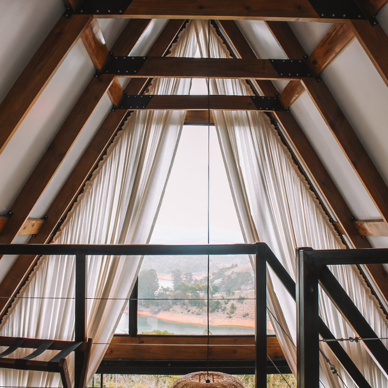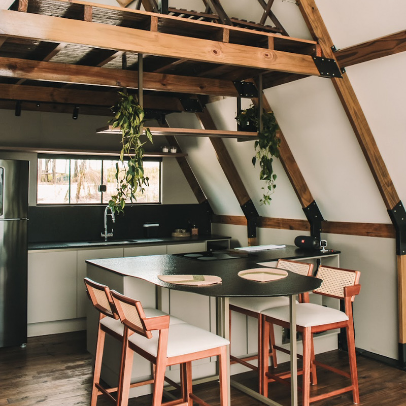 Em Natividade da Serra, a Cabana Haus é uma daquelas cabaninhas que fazem a gente esquecer do tempo – um refúgio cercado de silêncio, natureza e conforto, perfeito para um bate-volta. A arquitetura em formato A-frame tem um toque moderno e, na sala, o sofá 360°, a lareira e a Smart TV criam um clima acolhedor, enquanto a cozinha integrada vem equipada com fogão de indução, geladeira, airfryer, cafeteira, forno e todos os utensílios necessários. No mezanino, o quarto de casal tem enxoval macio, cortinas que bloqueiam (parcialmente) a luz da manhã e uma vista ampla das montanhas.
