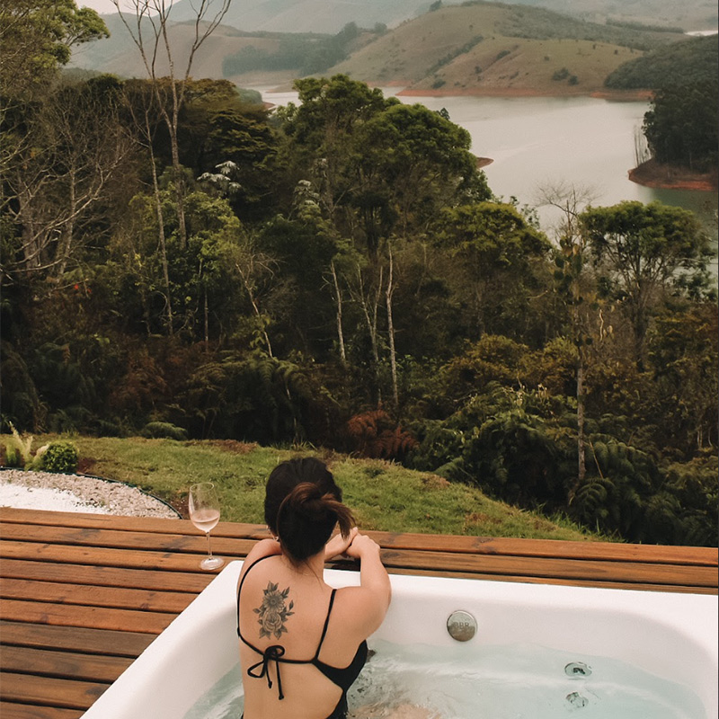 Do lado de fora, o deck de madeira é o destaque: jacuzzi com hidromassagem e cromoterapia, aquecida para os dias frios, além de churrasqueira, firepit e uma vista aberta para a Represa de Paraibuna. À noite, luzes de LED entre as árvores criam um clima intimista, ideal para um vinho ao ar livre. Obs: o acesso é fácil e a cabana fica próxima ao centro da cidade, mas tem uma pequena parte de estrada de terra. Diárias a partir de R$ 860.