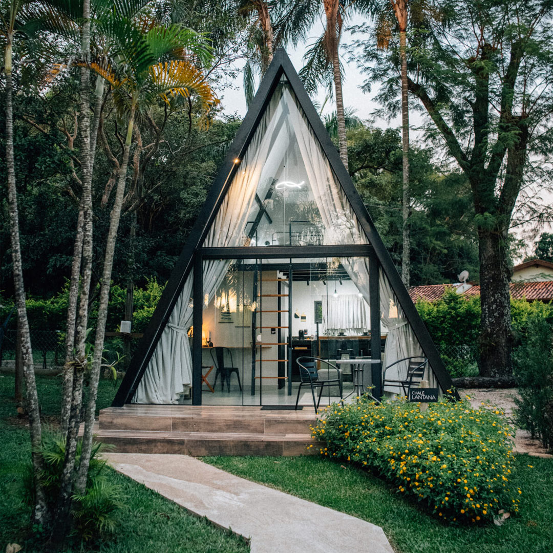 Cabana em formato A-frame super romantica, aconchegante e com climinha acolhedor. Na área externa, uma varandinha privativa com vista para o jardim que estende por todo o terreno.