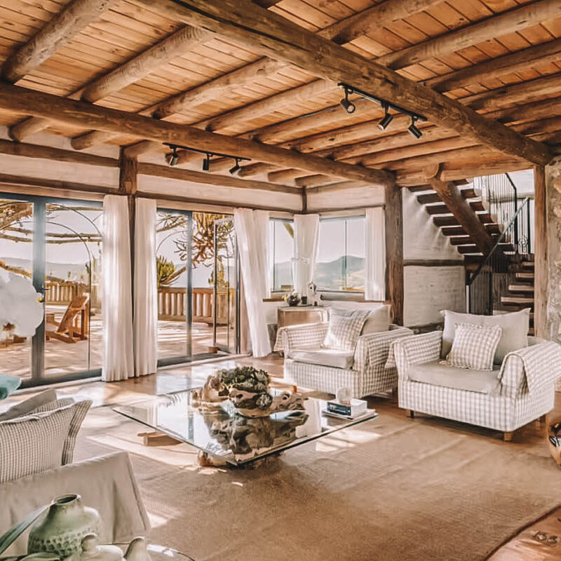 O interior da cabana mistura peças de design internacional com toques do Brasil popular, criando um ambiente cheio de personalidade. Do lado de fora, o espaço é um convite para desacelerar: um gramado amplo, piscina natural integrada à cabana, área de firepit para noites de fogueira, espaço gourmet com churrasqueira e uma rede de balanço.