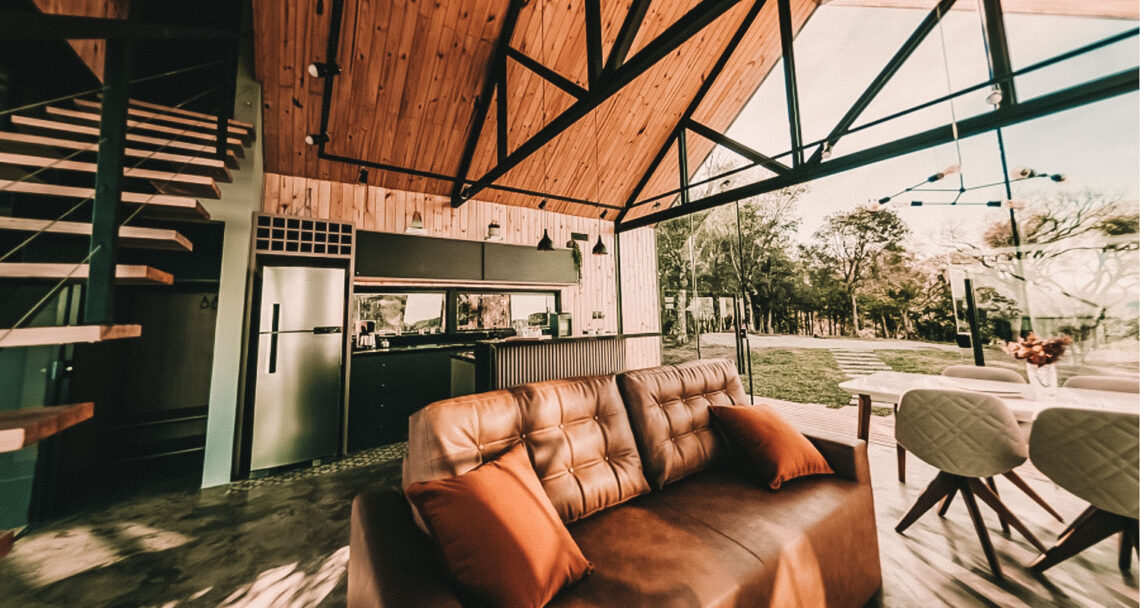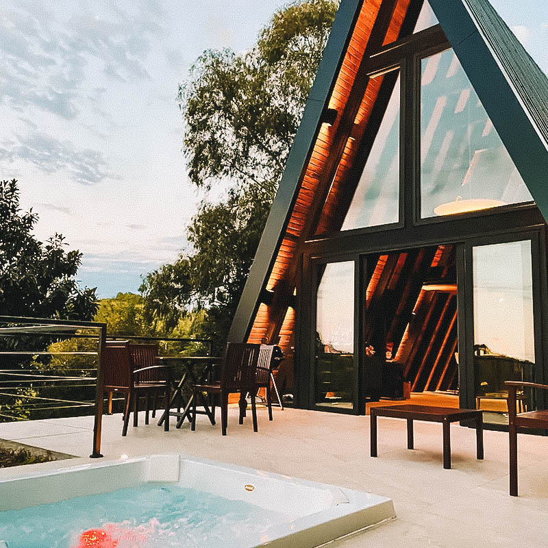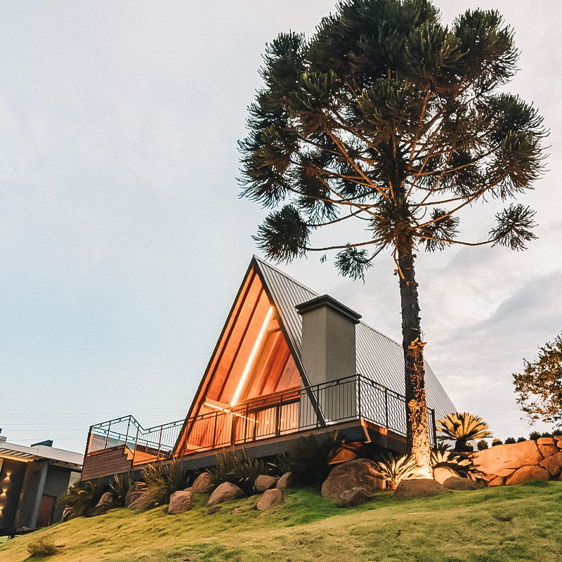 A cerca de 20 minutos de Caxias do Sul, a cabana A-frame combina luxo e conforto, oferecendo uma experiência inesquecível inspirada nas melhores acomodações do Hemisfério Norte. Entre os destaques da hospedagem, estão a jacuzzi com hidromassagem e cromoterapia, a lareira e churrasqueira americana no deck. Com piso aquecido, deck externo e isolamento térmico, a cozinha gourmet da cabana é totalmente equipada. Cercada por uma vasta área de mata nativa, oferece privacidade e acesso rápido às melhores vinícolas e restaurantes da região. Diárias desde R$ 890.