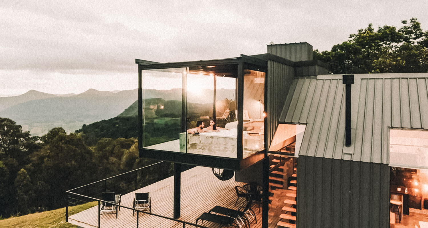 Reinaugurada e cuidadosamente projetada com inspiração italiana, esteja preparado para uma experiência única em uma acomodação no topo da montanha, com vista panorâmica, casinha construída com tijolos de demolição centenários e onde as nuvens se mesclam com com o verde da natureza proporcionando vistas privilegiadas da Serra Gaúcha. Além disso, conta com banheira de hidromassagem, piscina privativa, balanço infinito, rede suspensa com vista para o vale e churrasqueira interna. E mais: os hóspedes ainda podem usufruir de toda a estrutura de mais de cinco hectares da fazenda, conhecendo o sítio inteiro, o parreiral de uvas, fazer uma caminhada, servir um piquenique no pôr do sol e sentir a brisa da serra no balanço infinito. Diárias a partir de R$ 1 140.