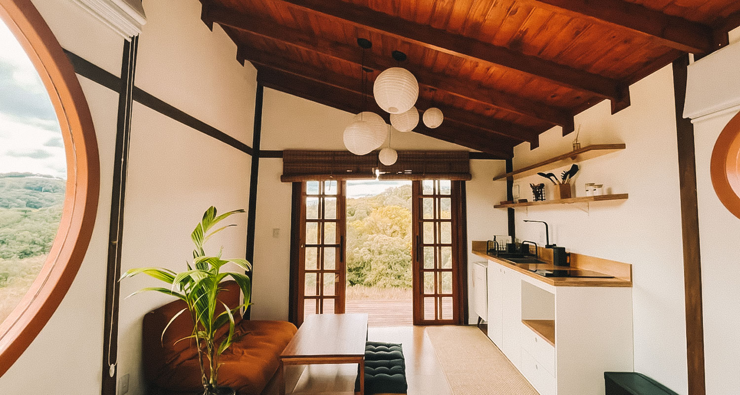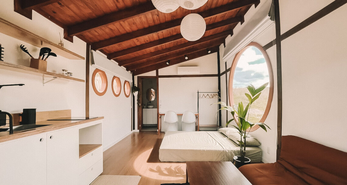 Na área rural de Caxias, próxima ao Cânion Palanquinhos, é literalmente uma microcasa inspirada no Japão. Com cama queen baixa, móveis minimalistas e porta shoji, o espaço oferece uma experiência autêntica e compacta. O ofurô de madeira traz o charme dos banhos japoneses, enquanto o jardim externo, inspirado em jardins do país, oferece um clima tranquilo ao anoitecer com lanternas orientais. E mais: há um projetor que pode ser usado dentro ou fora da casa, perfeito para curtir filmes ou séries em contato com a natureza. Diárias a partir de R$ 365.