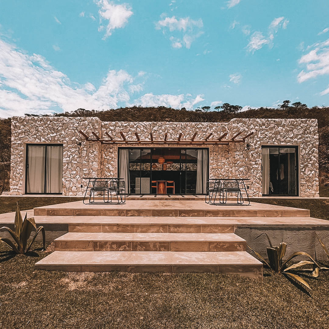Por fora, arquitetura com vibes medieval italiano com paredes erguidas com pedras brancas. Por dentro, a modernidade brasileira, com decór moderna, aconchegante e ambientes integrados e bem iluminados. Conte com sala de estar, cozinha com ilha, duas suítes e até mesmo uma banheira de imersão. A área externa também está ali para acrescentar, com deck de 50 m², mesa e cadeiras e a vista das montanhas ao fundo.