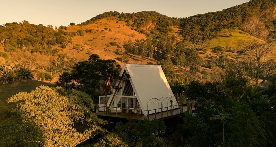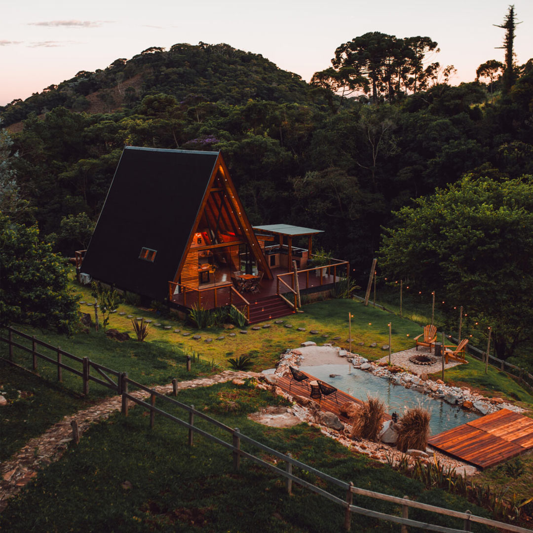 Inspirada nas Cabanas a-frame americanas e canadenses, junta arquitetura e sossego em um belo espaço cercado por natureza. Feita toda em madeira rústica e decorada com bastante luxo e design, abriga até dois hóspedes e conta com jacuzzi, churrasqueira, piscina, fogueira, horta e jardim. Entre os serviços extras oferecidos, estão um day spa, por R$ 300, um delicioso piquenique, por R$ 150, mesa romântica e queijos e vinhos, por R$ 180. Lá, é possível desfrutar de um lindo pôr do sol à beira da lareira e reunir momentos de paz e tranquilidade, uma maneira de se desconectar da vida corrida.