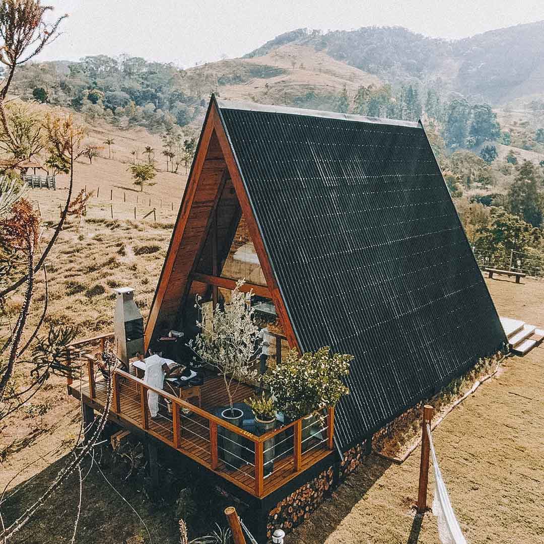 Inspirada nas Cabanas a-frame americanas e canadenses, junta arquitetura e sossego em um belo espaço cercado por natureza. Feita toda em madeira rústica e decorada com bastante luxo e design, abriga até dois hóspedes e conta com jacuzzi, churrasqueira, piscina, fogueira, horta e jardim. Entre os serviços extras oferecidos, estão um day spa, por R$ 300, um delicioso piquenique, por R$ 150, mesa romântica e queijos e vinhos, por R$ 180. Lá, é possível desfrutar de um lindo pôr do sol à beira da lareira e reunir momentos de paz e tranquilidade, uma maneira de se desconectar da vida corrida.
