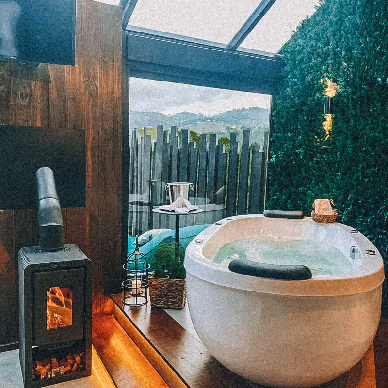 O Chateau do Sossego é um espaço de luxo, elegante, com design aconchegante e moderno para curtir um final de semana a dois. Tem banheira no quarto, vista para as montanhas e espaço para um picnic especial regado a vinho e queijos. Além disso, serviços como day spa e mesa romântica estão disponíveis à parte.