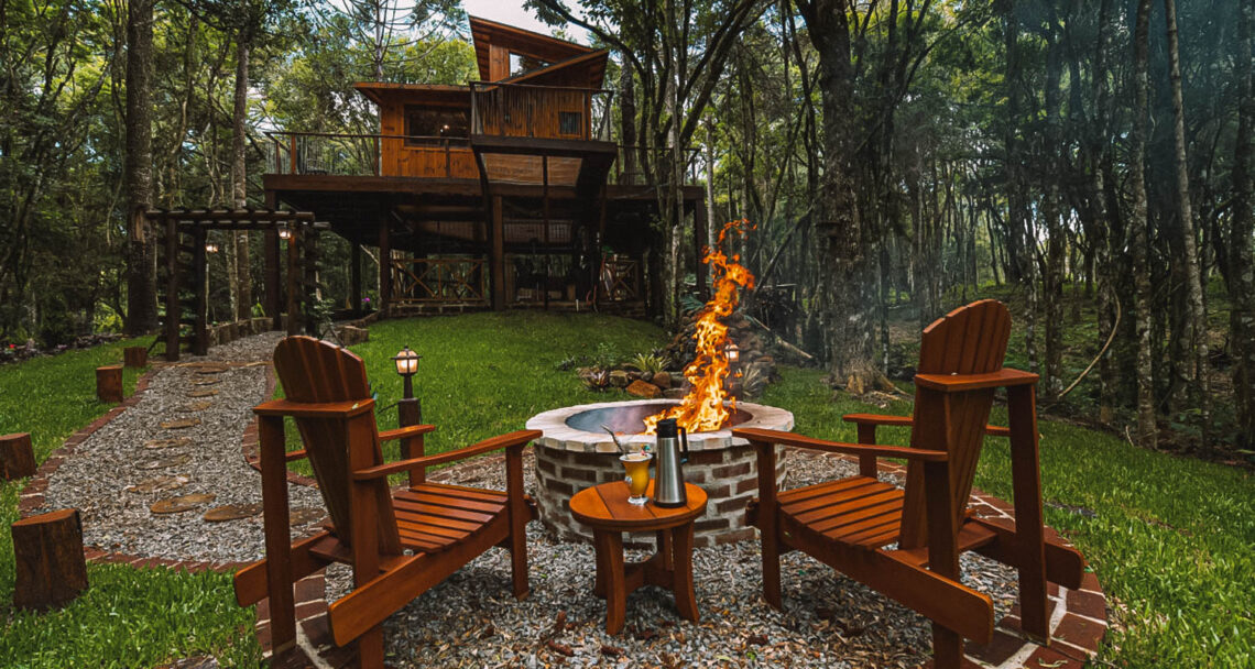 CABANAS NA SERRA GAÚCHA: sob troncos, em uma estadia experiência clássica de casa na árvore, essa propriedade busca proporcionar conexão com a natureza em um espaço totalmente privativo, com bosque exclusivo e o som dos pássaros pairando pelo ar. A casa é um ambiente único e integrado onde é possível acomodar até 5 pessoas. No Desvio Blauth, a propriedade orgânica do Paraíso das Frutas é o jardim da propriedade e você pode desfrutar dela, passeando, pescando e consumindo pequenos frutos, mirtilo, framboesa e amora, na época de safra. Os anfitriões ainda oferecem kit básico de café da manhã para preparo com pão, frios, manteiga, mel ou geleia produzidos na propriedade, leite e café. (diárias a partir de R$ 950; dividindo entre 2 hóspedes são R$ 475 por pessoa por noite)
