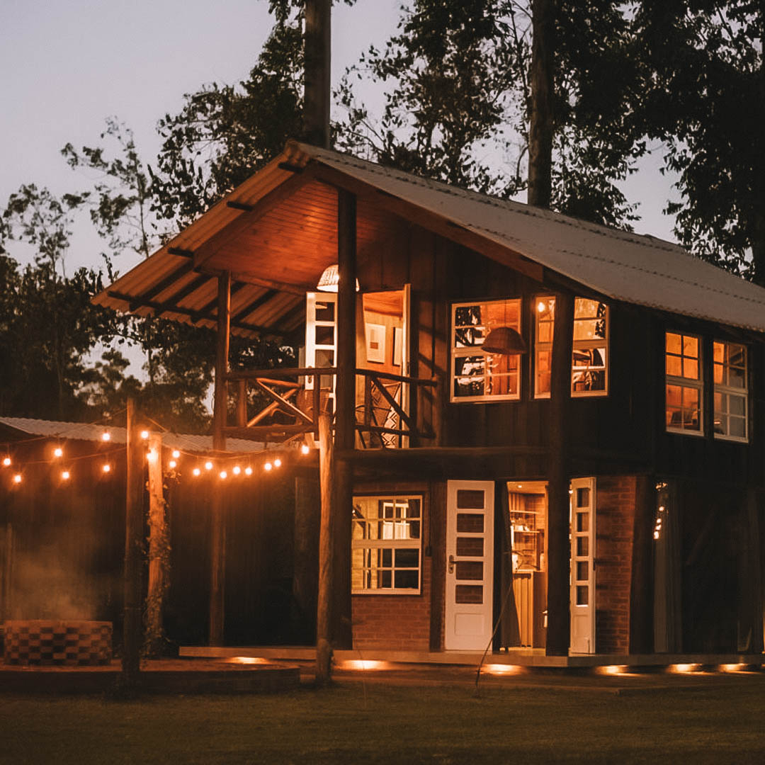 Onde antes fora um galpão de animais, transformou-se hoje em um chalé que inspira descanso, bom vinho sob a lareira e integração com a natureza. O chalé celeiro está a 70km de Gramado, em Rolante, e capricha quando o assunto é ser um refúgio acolhedor. Sem deixar as marcas do passado, a casinha foi renovada com conforto, mantendo o tom rústico, com madeira original, vigas aparentes e outros detalhes. Dentro, você pode desfrutar da sala de estar, lareira e uma cozinha compacta mas eficiente integrada ao ambiente, com geladeira, cooktop, microondas, forno elétrico, além de armários com diversos utensílios e eletroportáteis. Na parte de cima, o quarto principal com cama queen, enxoval completo e cortinas blackout. Já na área externa, um amplo gramado se estende ao redor do espaço, assim como o lago e a varandinha com firepit e luzinhas charmosas. (diárias a partir de R$ 452; dividindo entre 2 hóspedes são R$ 226 por pessoa por noite).