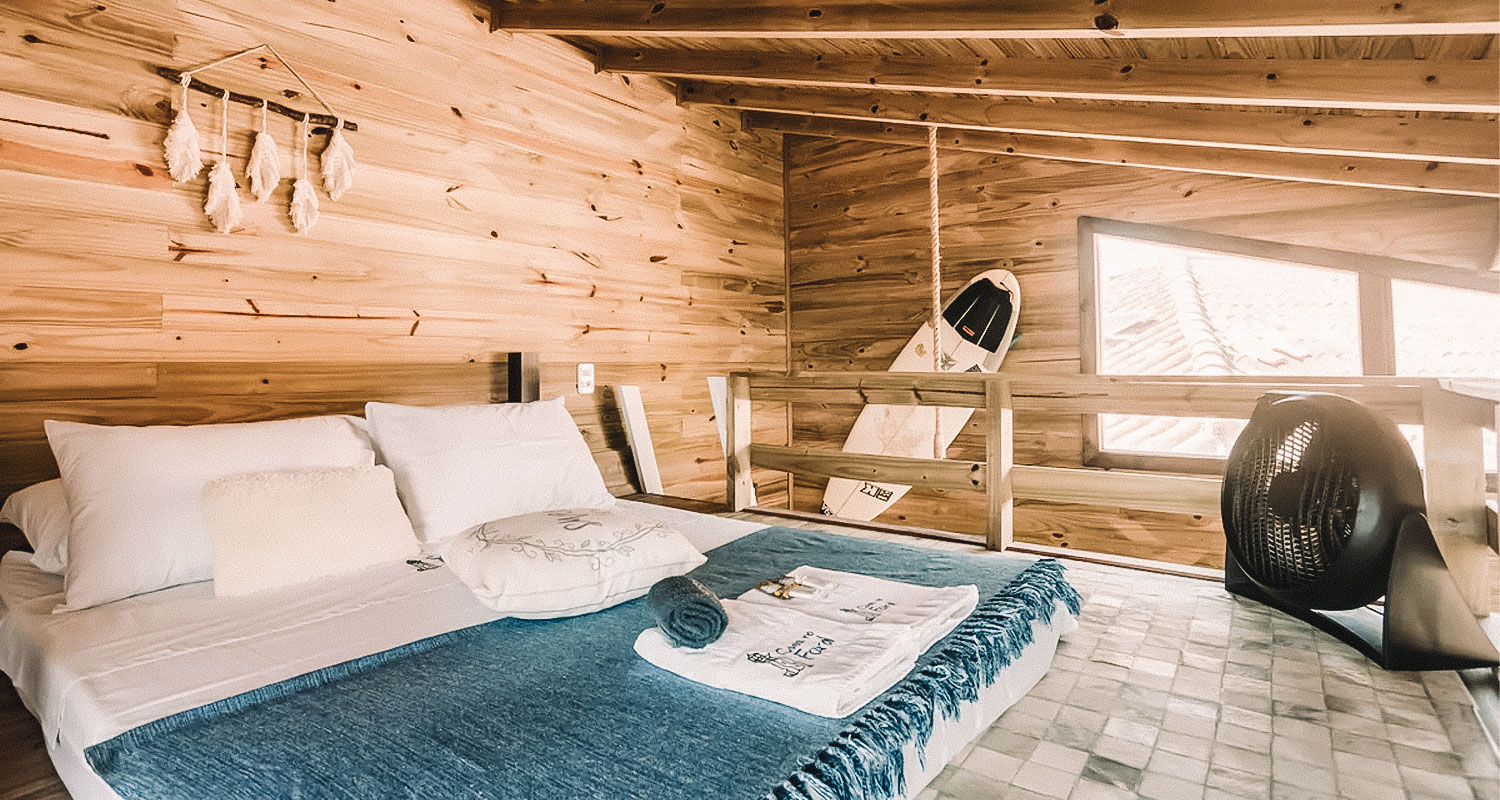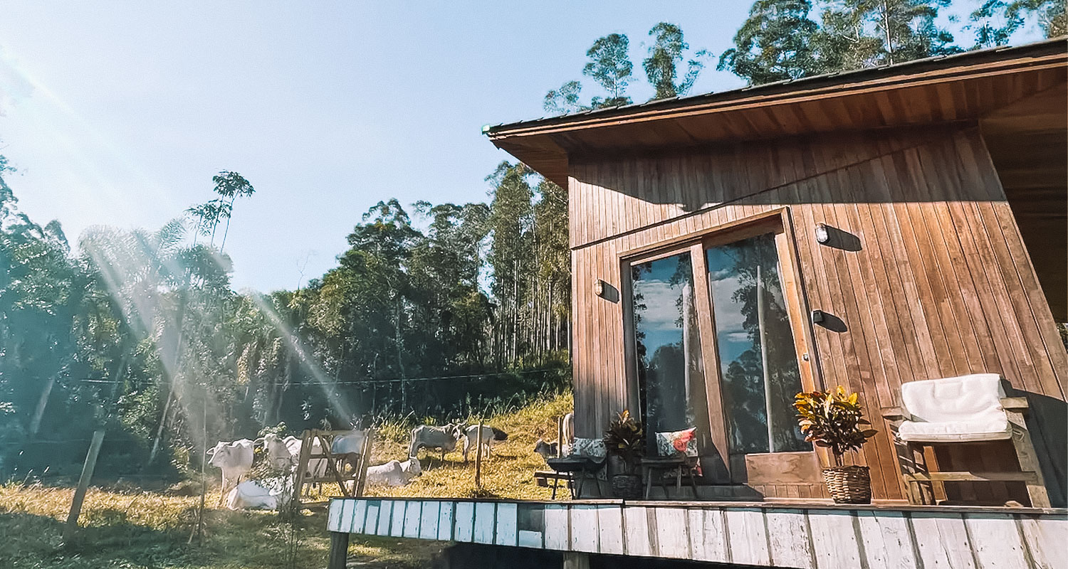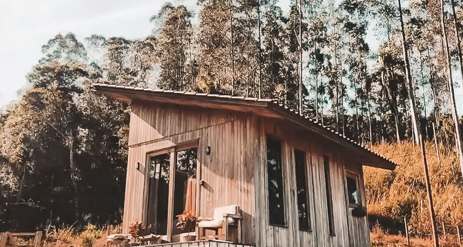 A 1h30 de Florianópolis, cercada por vegetação nativa e com uma vista incrível para o açude da propriedade, a cabana fica ainda mais bonita no nascer do sol. Com cozinha completa e churrasqueira, a tiny house foi pensada nos mínimos detalhes: o telhado e o jardim vertical ajudam a manter o conforto térmico e reforçam o conceito de arquitetura biofílica, que valoriza o contato com o ambiente natural. Dentro, o clima é de puro aconchego e, do lado de fora, tem redário, trilhas, mirante, fogueira e um jardim. A localização é ótima – fica a cerca de 1,5 km da Praia da Ferrugem e a poucos minutos do centro, onde estão os restaurantes e mercadinhos. Diárias desde R$ 290.