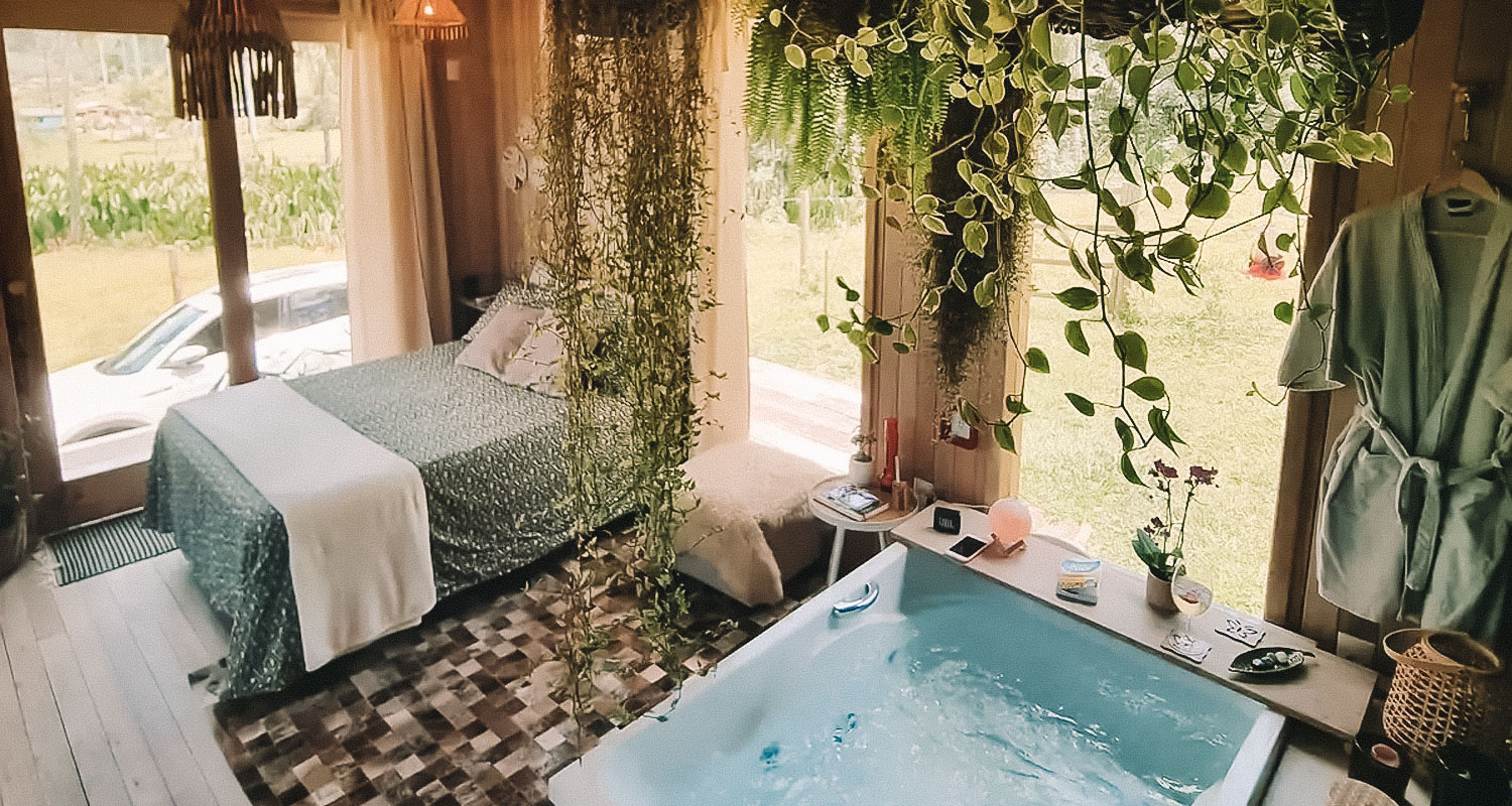 Em meio a árvores, flores e o som constante do rio, a cabana de madeira abriga apenas um casal e se destaca pela atmosfera acolhedora e pelas grandes aberturas de vidro que iluminam o interior. O quarto tem decoração natural, com macramês, plantas espalhadas e uma banheira de hidromassagem com vista para o jardim – de onde é comum ver beija-flores. A construção prioriza materiais reaproveitados, como madeira de demolição e vidros antigos, reforçando o cuidado sustentável do projeto. Do deck, é possível observar o pequeno lago da propriedade e as luzes da Serra do Rio do Rastro. Diárias desde R$ 440.