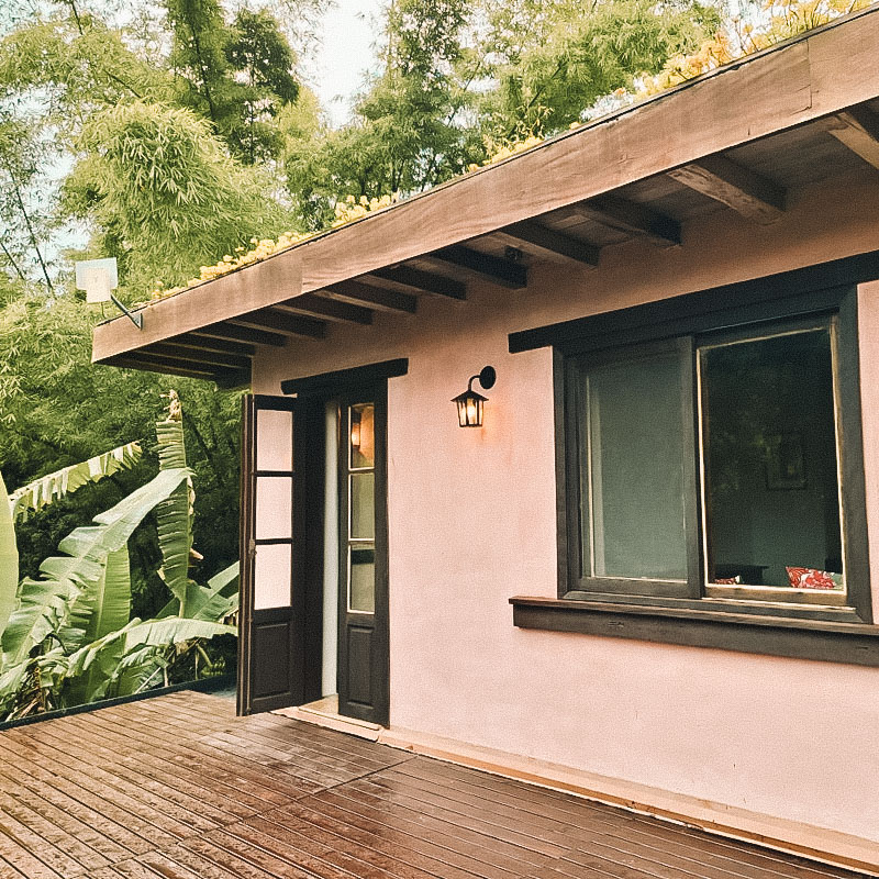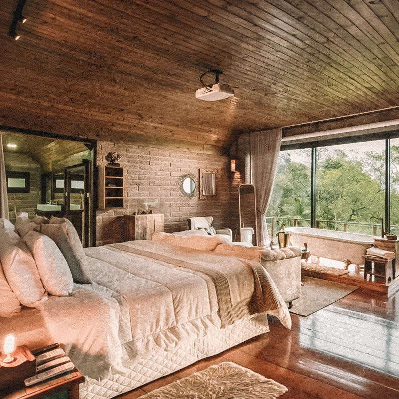 Com decoração clean, leve e cheia de detalhes naturais, a cabana tem aquele ar de casa de praia, a poucos minutos do mar. Entre palha, madeira e plantinhas espalhadas pelos cantos, o clima é tranquilo e cheio de luz. O quarto tem cama queen com enxoval macio e uma banheira de imersão voltada pro jardim. A cozinha é pequena, mas tem tudo o que precisa, e do lado de fora o deck com espreguiçadeiras e o cinema ao ar livre deixam a noite ainda mais gostosa. Diárias desde R$ 564.