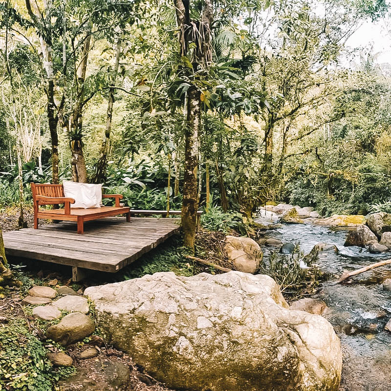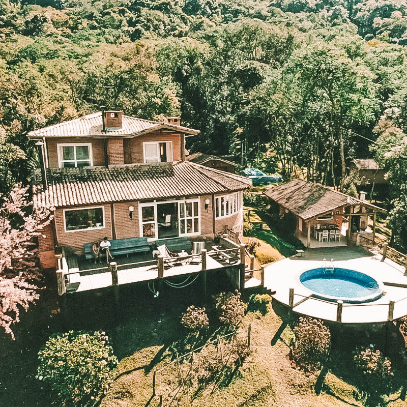 Localizado dentro de uma reserva natural particular no bairro Santa Bárbara do Alto, a 20 km de Monteiro Lobato, a propriedade dispõe de quatro casas rústicas distantes e com total privacidade, além de oferecer churrasqueira, forno de pizza, piscina, horta, jardim e um deck com vista surpreendente das montanhas. A uma altitude de 1 500 metros, rodeado de beleza natural e cachoeiras por perto (em um raio de 500 metros, tem seis cachoeiras lindas!), as casinhas são feitas de tijolos com itens da decoração em madeira, e há várias trilhas pelas redondezas. Diárias a partir de R$ 1 800.