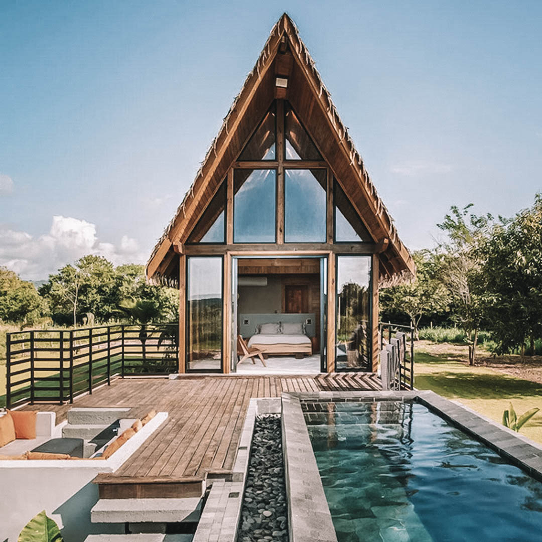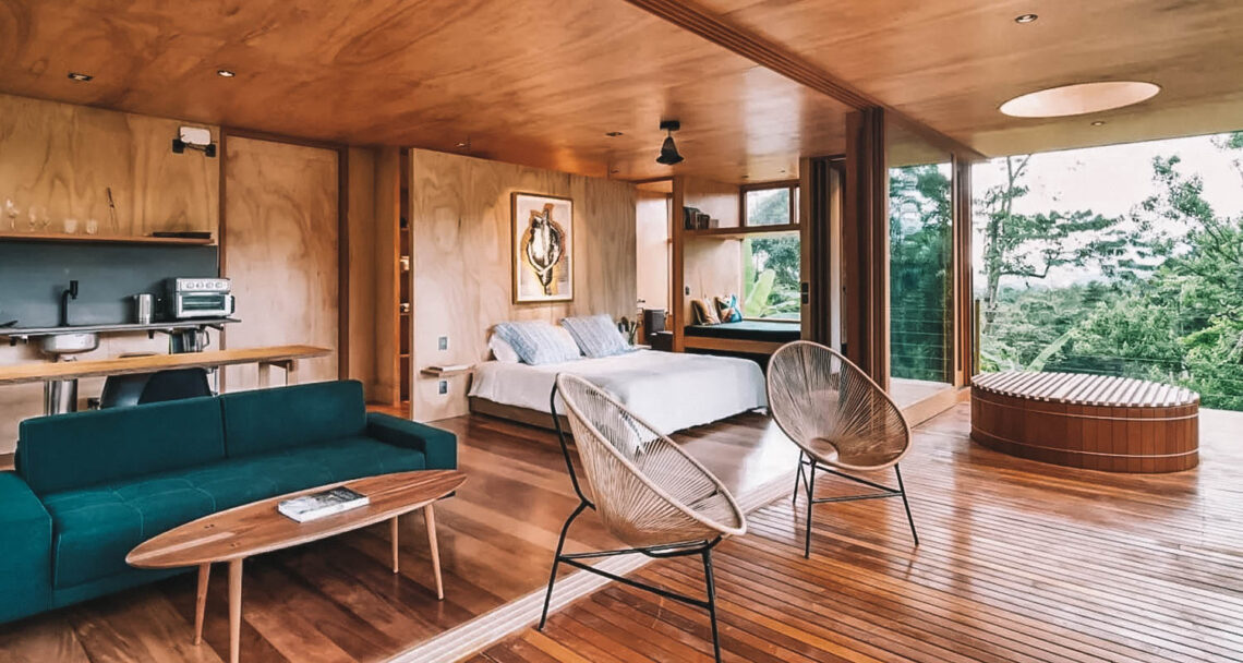 Dentro de uma propriedade com mais de 700 mil metros quadrados de área verde preservada, ela é ideal para quem procura design, conforto e contato com a natureza. Além da cabana em si, com deck, cama king, tv, cozinha equipada e ofurô nãovaranda, o hóspede ainda tem acesso a trulhas, cachoeira, horta e todas as instalações do resort nos arredores (acesso gratuito ao resort).