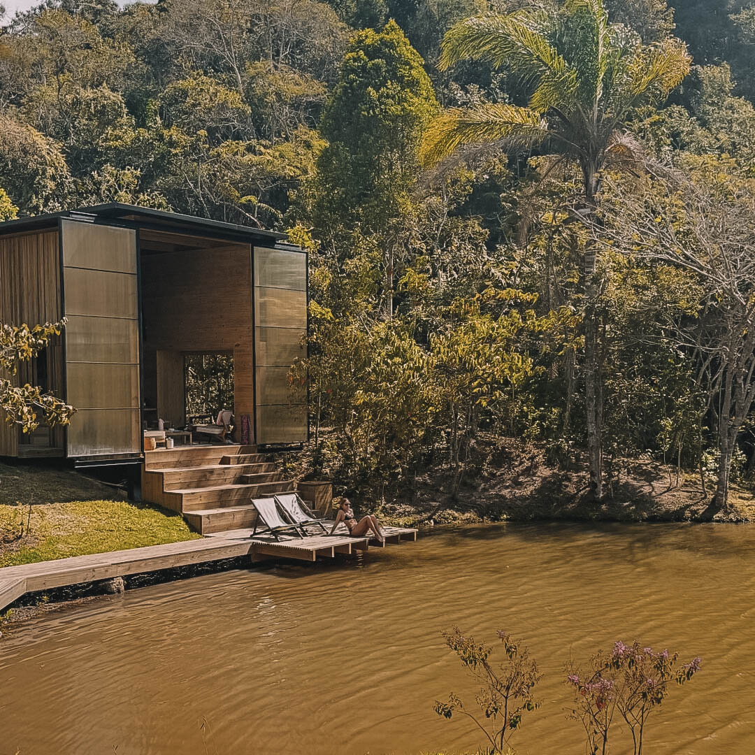 À beira da represa, construída de forma sustentável, a cabana é privativa e camuflada na mata nativa e selvagem. A experiência de imersão já começa no trajeto, já que o espaço funciona quase como uma ilha, com acesso feito por um translado de barco (incluso na hospedagem) em uma lancha de 28 pés (já incluso na hospedagem). Toda em madeira, é equipada com quarto com cama queen, uma salinha de estar aconchegante, banheira externa no deck com espreguiçadeiras, e, claro, o acesso direto à represa.
