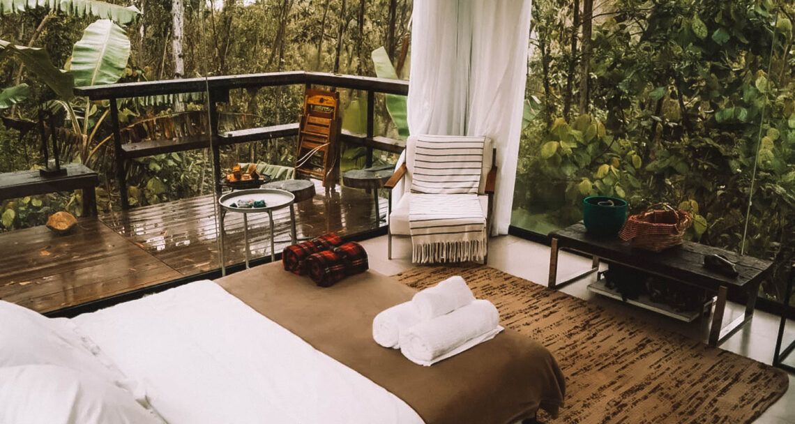 No Refúgio 4 a vibe é a mesma da propriedade toda: imersão no verde da natureza através de uma estrutura totalmente de vidro, do quarto, à banheira e a cozinha. Dentre as facilidades para maior conforto você encontrará cama queen size, roupas de cama e de banho, edredom, manta e travesseiros, ar condicionado quente e frio, Wi-Fi, bem como uma cozinha bem equipada com itens básicos. Diárias a partir de R$ 1 344.