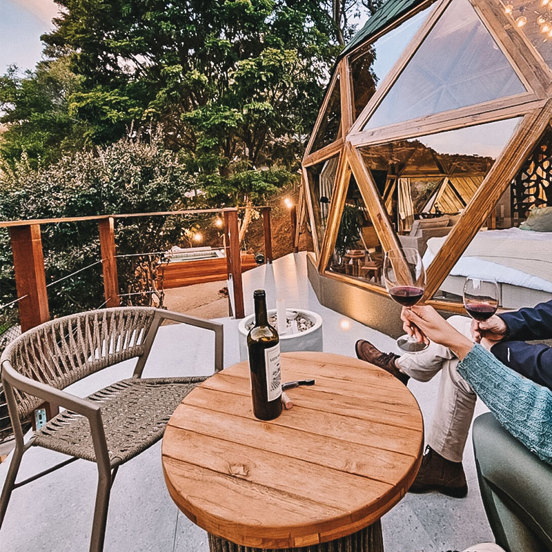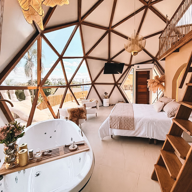 O domo é o refúgio perfeito para quem quer se desconectar e aproveitar a tranquilidade da serra: em 30m², a cabana oferece cozinha completa, banheiro com ducha de cromoterapia, cama de casal Trousseau que desliza para o lado de fora da hospedagem e permite dormir sob as estrelas, além de adega e retroprojetor para momentos de cinema. Na área externa, o deck com vista para o Morro do Saboó tem churrasqueira, mesa ao ar livre, espreguiçadeiras, ducha, banheira de imersão e sauna de vidro, e ainda é possível incluir serviços extras como café da manhã, brunch e massagem. Diárias desde R$ 1 290: RESERVE AQUI COM 5% DE DESCONTO NO PIX VIA HOLMY!