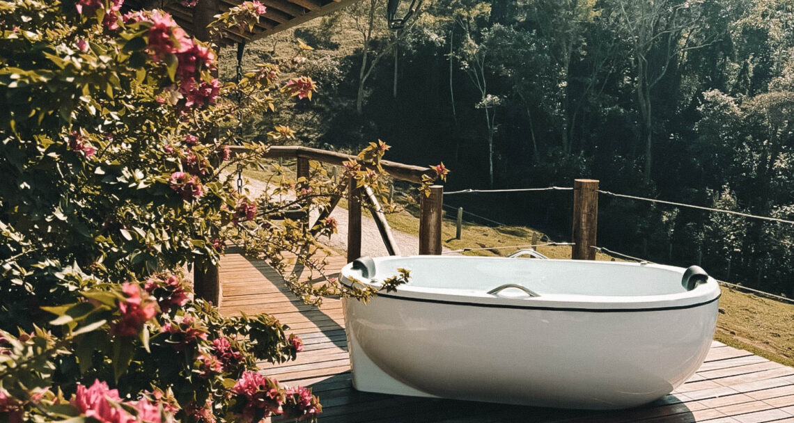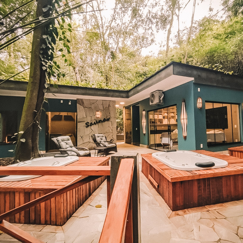 A 1h20 de Campinas, a Pousada Chão de Folhas fica em Águas de Lindóia e é exclusiva para adultos. Conta com apenas seis suítes rodeadas pela natureza, cada uma equipada com varanda, cama king, banheira de hidromassagem e chuveiros duplos. O grande destaque vai para o SPA, cercado pela mata nativa, que oferece ofurô ao ar livre, saunas seca e a vapor, além de massagens, drenagem linfática e terapias com pedras quentes. Dormir ao som das árvores e da cachoeira, acordar com a visita de pássaros e animais silvestres e aproveitar a jacuzzi do quarto tornam a experiência ainda mais especial. Diárias desde R$ 714.