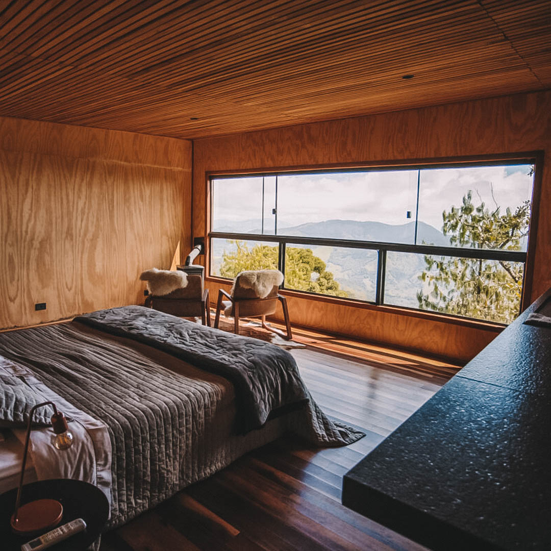 A 20 km de Monte Verde, o espaço combina arquitetura moderna com um ambiente acolhedor e integrado à paisagem. As janelas amplas enquadram o verde, enquanto a estrutura oferece sauna seca, banheira de hidromassagem, lareiras interna e externa e um deck panorâmico com vista para o vale. Com cozinha completa, adega de vinhos selecionados e produção própria de mel, o local ainda conta com um jardim com redário e lago.