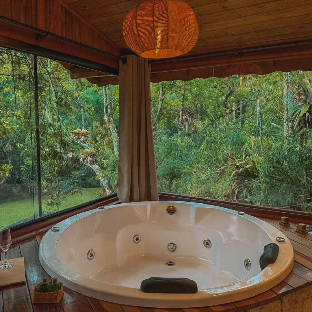 Do lado de dentro uma cama king sinze, ar condicionado, Wi-Fi e smart TV, lareira, cozinha bem equipada e até hidromassagem com vista. A área externa conta com duas banheiras de imersão e ducha, churrasqueira e espaço para a fogueira. Tudo isso com muita privacidade e calmaria a apenas oito minutos do centro.