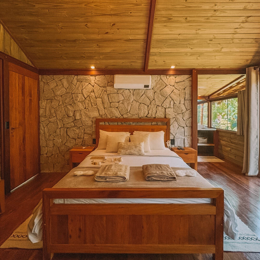Aqui, uma imponente parede de pedras acomoda a hospedagem com quarto, banheira de hidromassagem, salinha e um banheiro. A área externa conta com espreguiçadeiras, ducha, rede de balanço, mesa para refeições.
