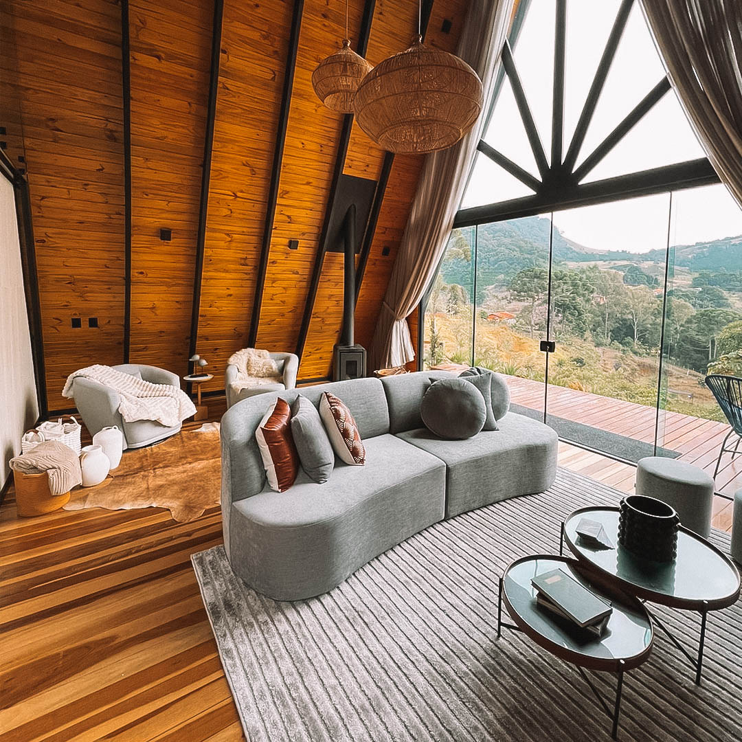 Com 70 m² em estilo A-frame e toques de farmhouse, a cabana é perfeita para casais, com destaque para a banheira na sala, área externa com deck e espreguiçadeiras, sauna com ducha e uma acolhedora área de fogueira que oferece vistas incríveis, permitindo que você desfrute da natureza com total privacidade.
