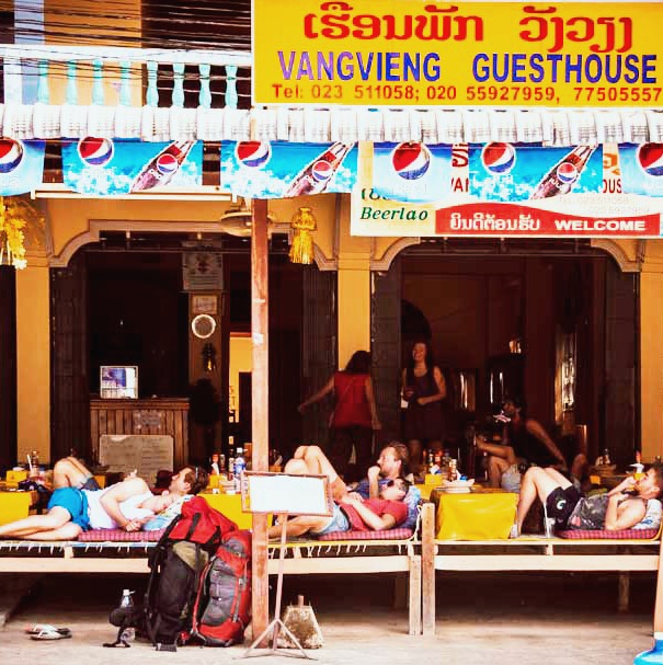 Vang Vieng é uma cidade rural do Laos com cerca de 50 000 habitantes entre Luang Prabang e Viantiane. Às margens do rio Nam Song, é rodeada por um bonito panorama de montanhas cársticas de calcário (paredões rochosos cheios de sulcos e cavernas) e campos de plantação de arroz, com balões voando no horizonte. Mochileiros desembarcam ali pra descer de boia na leve correnteza do Nam Song, fazer trilhas e escalada, curtir a vida noturna (inexistente no resto do Laos) e ficar numa boa.