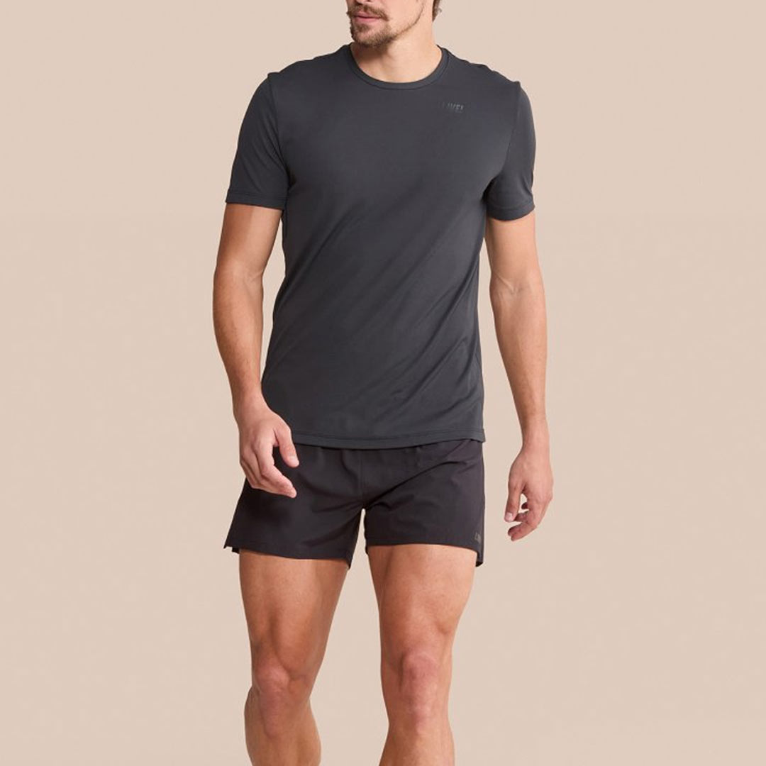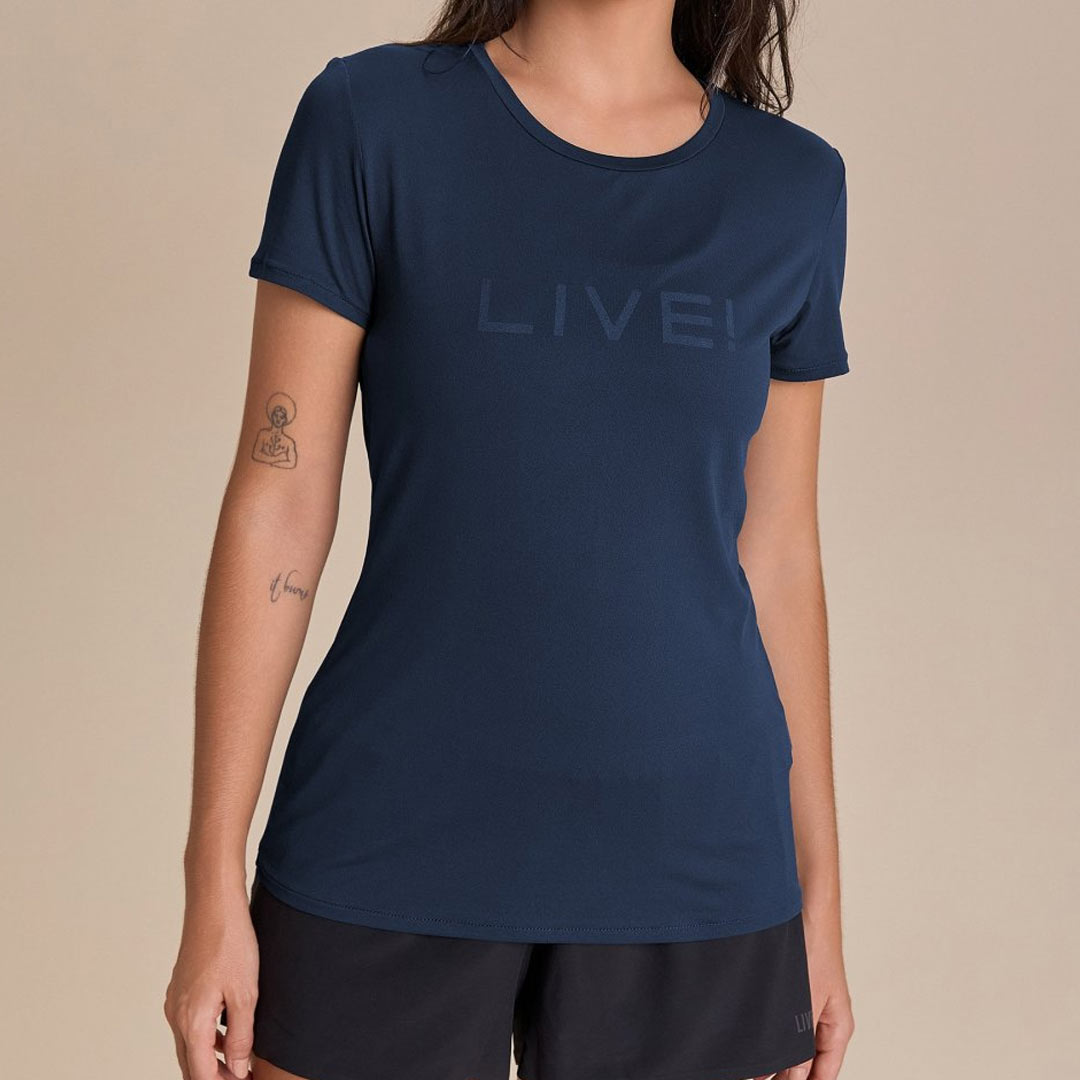 Outro básico sem erro, com a estampa LIVE!, modelagem levemente solta, tecido respirável e tecnologia Quick Dry, que auxilia na absorção da umidade, e a Easy Care, para maior durabilidade.