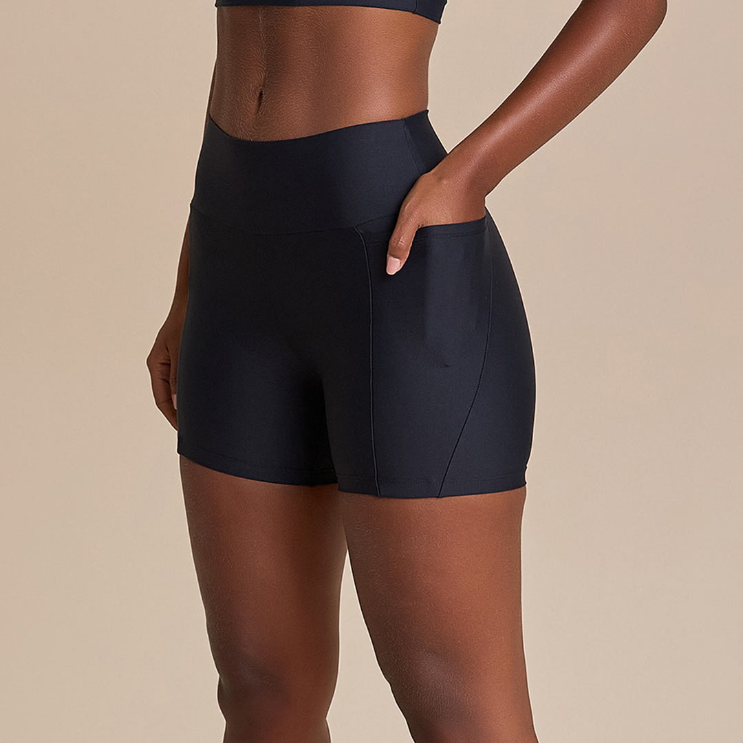 A bermuda das corredoras. Possui seis bolsos estrategicamente posicionados: dois laterais, três no cós e um interno frontal, além do silicone gripper na barra pra não enrolar.