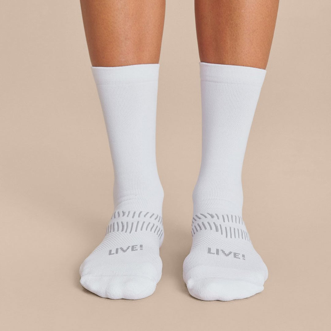 As meias estão disponíveis em diversas medidas e tecidos. A Run possui cano alongado, detalhe refletivo e é confeccionada com o fio especial Sensil® BodyFresh, que inibe a proliferação de bactérias causadoras de odor.