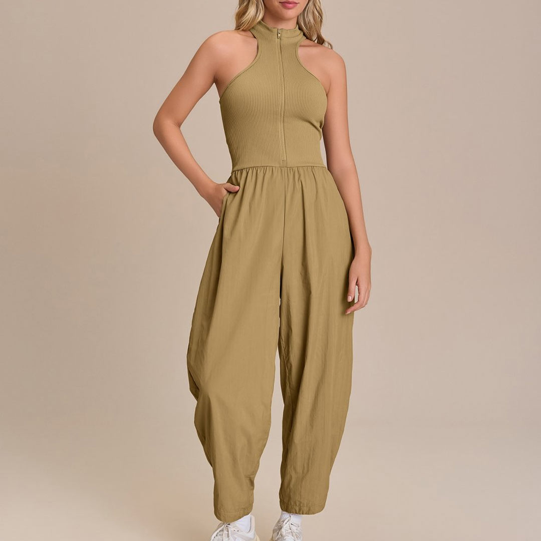Além das peças fitness, a LIVE! também possui em seu catálago uma aba inteira de looks casuais, com calças, camisas, macacões e outras peças super a vibe athleisure, como esse macacão de Nylon Net e canelado em Seamless.