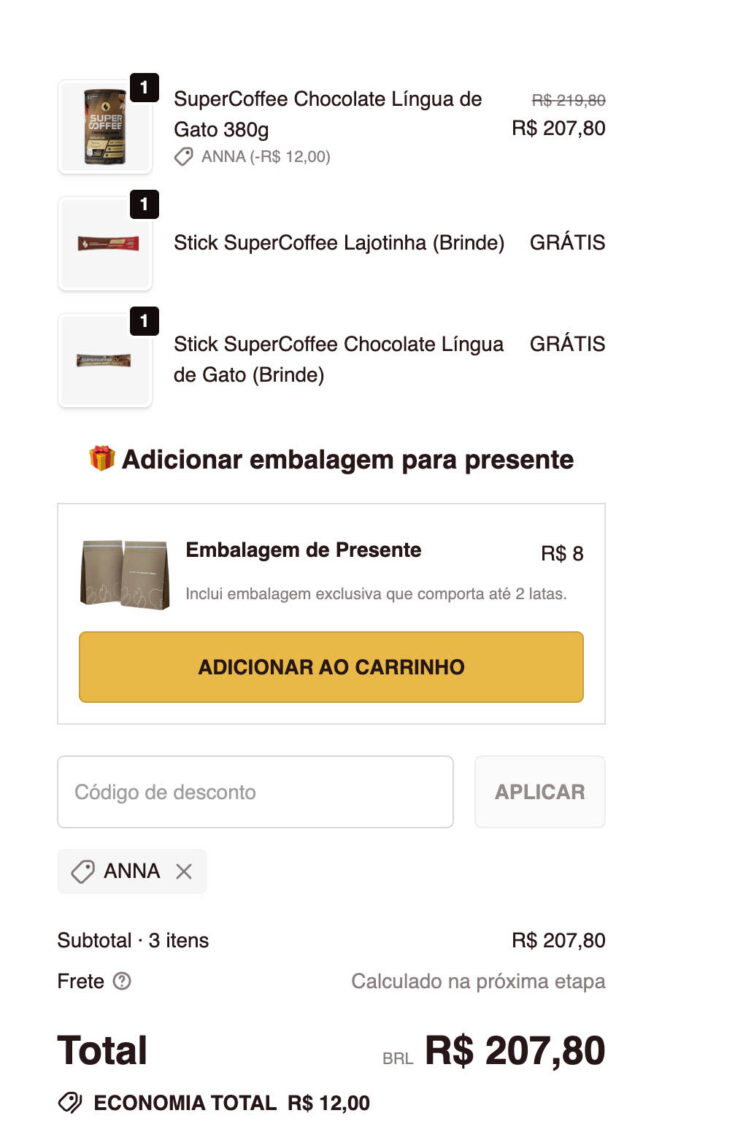 Para usar o cupom de desconto SuperCoffee é super simples. Basta adicionar seus produtos no carrinho, clicar em finalizar compra, que então você será direcionado para a página de confirmação. Lá, adicione o cupom de desconto SuperCoffee ANNA na aba de código.