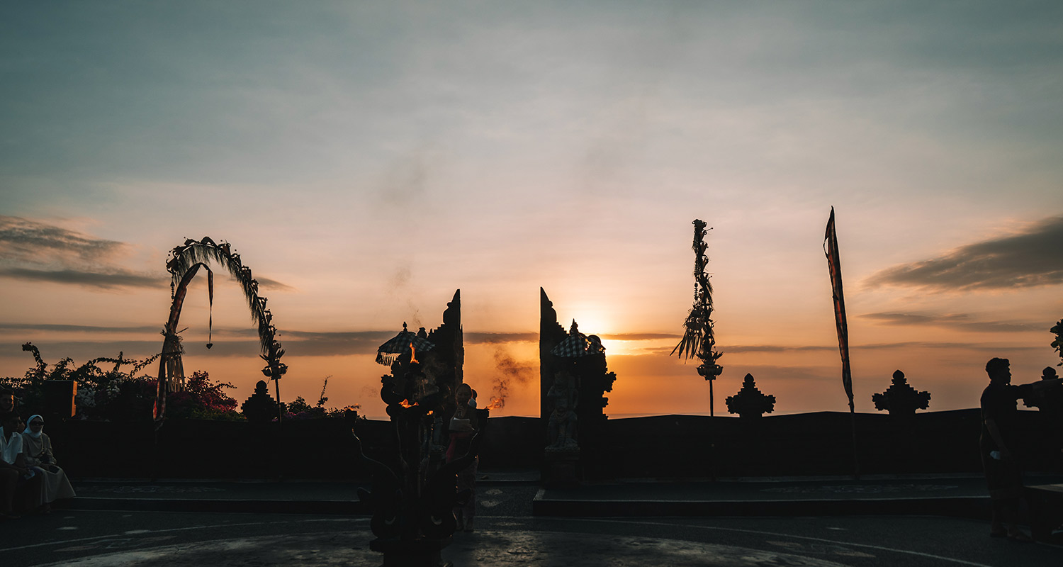 A Dança Kecak, realizada ao pôr do sol, é uma performance com o intuito de agradar espíritos e divindades, na qual uma narrativa é comunicada por meio de movimentos de dança e gestos. Nenhuma única palavra é falada ao longo do espetáculo – apenas sons característicos “cak-cak-cak”, enquanto os homens contam uma história por meio de movimentos corporais.