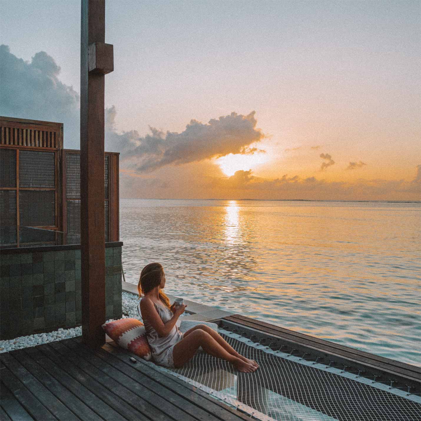 A oferta hoteleira é enorme. Cada propriedade reserva uma natureza selvagem mais exuberante que a outra, recifes de corais dos tons mais azuis que você já viu e acomodações que variam entre o luxo e o alto luxo. E é justamente a escolha do seu resort que vai determinar o tipo de viagem você vai fazer, já que vai ser nele que você vai passar todo o seu tempo, curtir o ambiente da ilha, fazer refeições e vai depender do lazer ofertado ali pra fazer os passeios mais bacanas. Pra eleger seu pequeno paraíso exclusivo, cercado por palmeiras e vistas infinitas do mar, vale focar no propósito da viagem, levar em conta seus gostos pessoais e as experiências que as estadias proporcionam: tem hotel mais pra casal em lua de mel, pra ir em família, com mar que se transforma literalmente numa lagoa, focado em atividades e esportes aquáticos, com dezenas de restaurantes de todos os tipos, com pegada mais sustentável, pra ver mantas gigantes e tubarões-baleia… Além de cada rede ter uma pegada específica, cada região das Maldivas também tem uma particularidade. Mais no centro dos atols – ilhas oceânicas formadas por recifes de corais –, por exemplo, o mar é calmo e é mais fácil encontrar vida marinha. Já quem vai com os pequenos normalmente prefere hotéis com bangalôs na praia, pra evitar riscos. Uma ideia interessante é dividir a estadia em mais de um resort, como eu fiz, assim a viagem fica mais dinâmica e você consegue unir vivências diferentes no paraíso. O combo preferido dos casais é primeiro reservar um quarto upscale num hotel mais exclusivo, com vibes românticas, e depois partir pra outra propriedade mais estilo resortão, com várias opções de restaurantes, tours, e atividades pra montar o roteiro.
