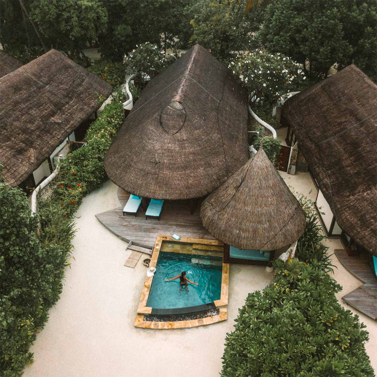 Nove tipos de quartos que variam entre bangalôs na praia e na água, sempre com piscina, para casais ou famílias e vista do nascer do sol ou do pôr do sol dividem-se entre os 96 bangalôs luxuosos do Four Seasons at Kuda Huraa. Os móveis creme e as camas com dossel complementam os telhados de palha, madeira e paredes de pedra branca dos bangalôs, todos feitos com materiais locais. Ponto mais que positivo para as novas suítes sobre a água (diárias desde US$ 1 400), que há cerca de dois anos foram reformadas com cores vibrantes e toques contemporâneos e ganharam uma enorme piscina de borda infinita no deck de mais de 100 metros quadrados com duas redes pra deitar e ficar admirando peixinhos e corais no mar cristalino, além de sofá, mesinha e espreguiçadeiras.