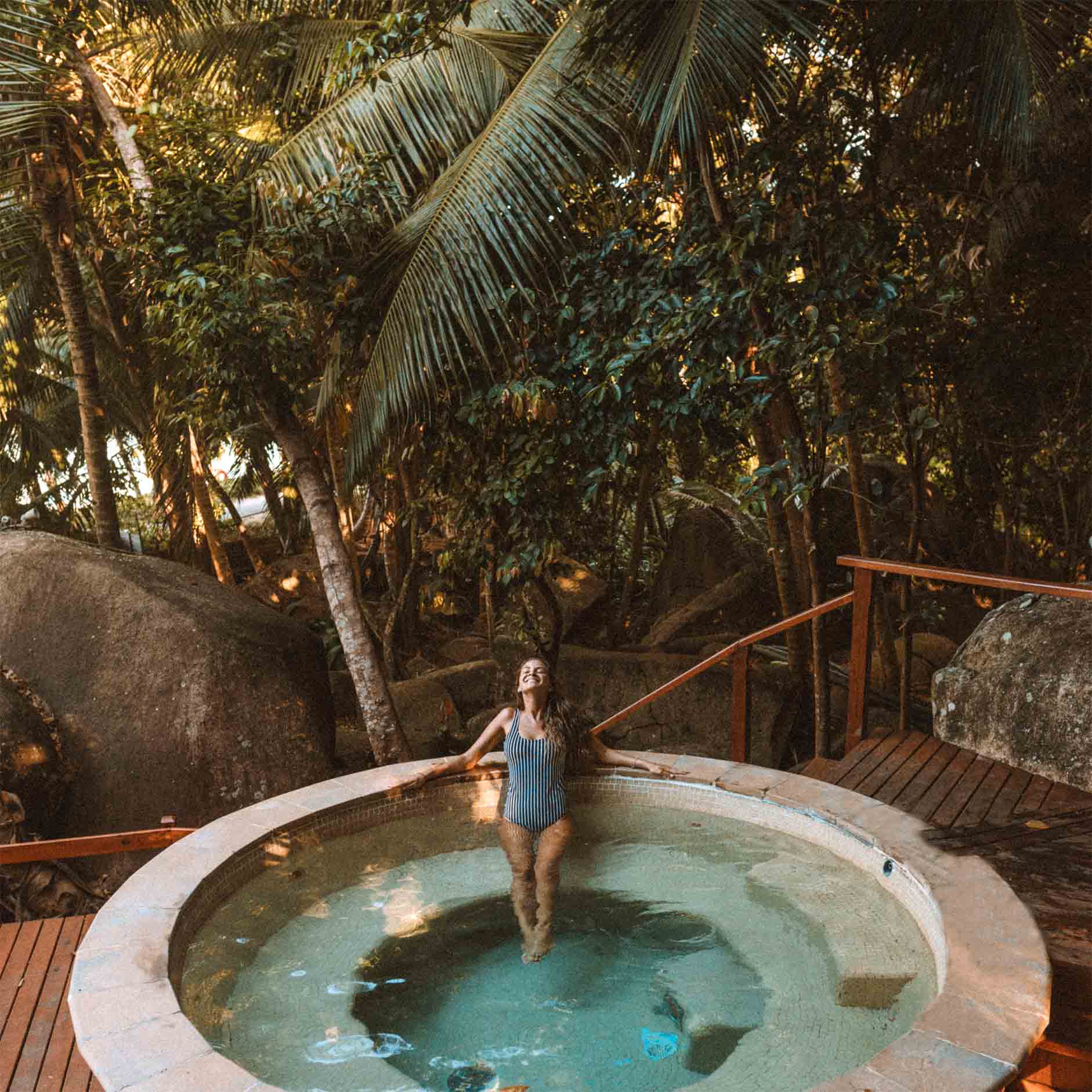 Totalmente integrado à atmosfera verde da ilha, com seis salas de tratamento, sala de descanso, sauna e sala de vapor adentradas em meio à mata e pedras gigantes, alcançadas por escadas externas onde só se ouve o canto dos passarinhos, o eForea spa é, seguramente, um dois mais incríveis spas de Seychelles. Na área da piscina e da jacuzzi, o cenário fica perfeito: folhagens das palmeiras fazem uma sombrinha gostosa ao ambiente do deck, pra relaxar após uma massagem com pedras quentes ou um tratamento pra rebalançar os chakras.