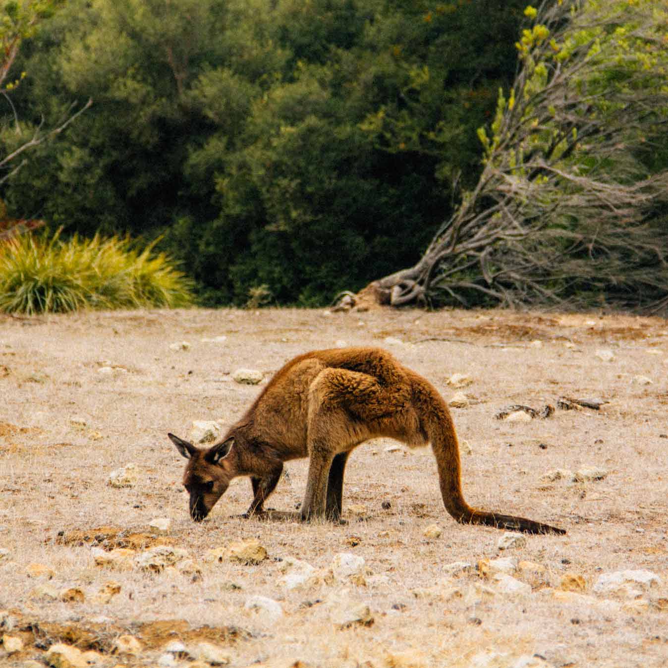 Estima-se que há cerca de 60 000 mil (!) cangurus na ilha (eles não têm predadores), de uma subespécie só existente ali – eles são baixinhos e acinzentados no geral, mas às vezes avista-se uns grandões. É só sair cedinho ou no fim da tarde para vê-los aos montes pelos campos. Para os coalas precisa apurar o olhar e levantar a cabeça em direção ao alto dos eucaliptos, onde eles se encarapitam e comem e dormem sem pressa nenhuma. O Kangaroo Island Wildlife Park, que cuida de animais órfãos e doentes, é um dos poucos lugares da Austrália onde você pode pegar um coala no colo (sempre meio polêmico poder tocar em animais selvagens, mas que é fofo, é).