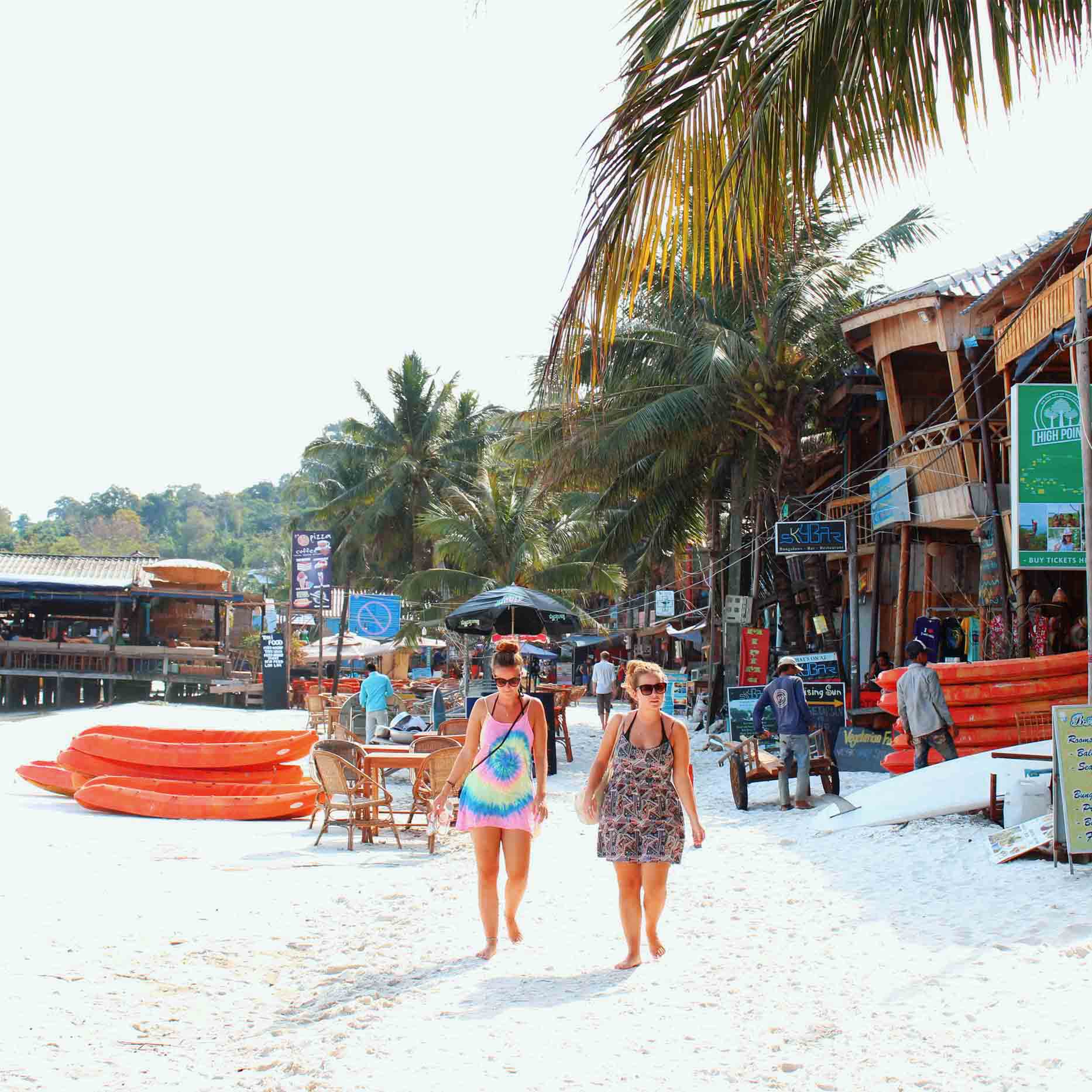 Em Long Beach e Sok San Beach (duas lindas praias contíguas lindas com algumas opções de restaurantes e hotéis mais sofisticados, legais pra quem está em lua de mel. Pra ir ao vilarejo de Koh Toch tem que ir de barco ou com trilha de 1h).