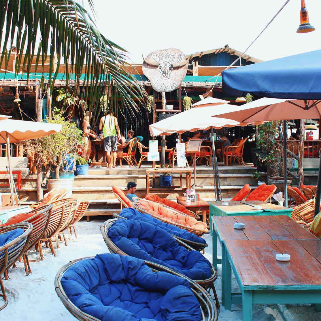 À noite rola um leve agito em alguns bares, mas nada demais, não tem baladas propriamente dicas e nem apresentações pirotécnicas como em Koh Phi Phi. Um fulano toca violão aqui, outro tem uma barraca de massas feitas na hora. O bar Vagabond costuma tocar música alta numa ambientação colorida. Para vistas incríveis, eu amo o Sky Bar, alcançável depois de subir 100 degraus morro acima. Pra jantar, o pessoal faz fila no Sigi ‘s Thai Food, que serve bons pratos tailandeses.