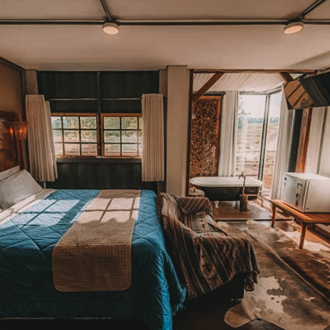 Inspirado nos chalés americanos, é todo feito em madeira rústica, decorado com sofisticação e ambientado com boa infra. O espaço é totalmente integrado, com cama queen, sala de estar, além da relaxante jacuzzi de hidromassagem.