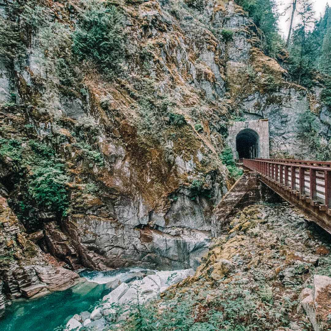 Já mais próximo de Vancouver, também é possível fazer uma parada no parque Othello Tunnels. O espaço é formado por uma sequência de túneis e pontes de trem que passam por grandes cavernas de granito e são guiadas pelo selvagem Rio Cocquihalla e suas águas translúcidas. O caminho ao todo tem 3,5 km e não tem erro, é só seguir reto a partir do estacionamento e ir admirando as formações perfeitas da natureza, o chão de pedras, o barulho da água correndo e vegetação que alcança as nuvens.