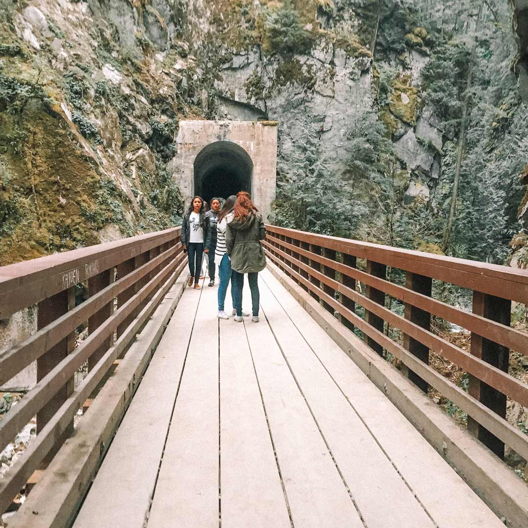 Já mais próximo de Vancouver, também é possível fazer uma parada no parque Othello Tunnels. O espaço é formado por uma sequência de túneis e pontes de trem que passam por grandes cavernas de granito e são guiadas pelo selvagem Rio Cocquihalla e suas águas translúcidas. O caminho ao todo tem 3,5 km e não tem erro, é só seguir reto a partir do estacionamento e ir admirando as formações perfeitas da natureza, o chão de pedras, o barulho da água correndo e vegetação que alcança as nuvens.
