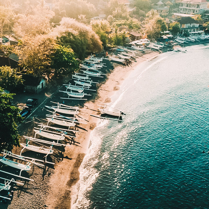 Amed é uma pequena vila de pescadores no Nordeste de Bali, conhecida por suas praias de areia vulcânica, águas cristalinas e vida marinha abundante.