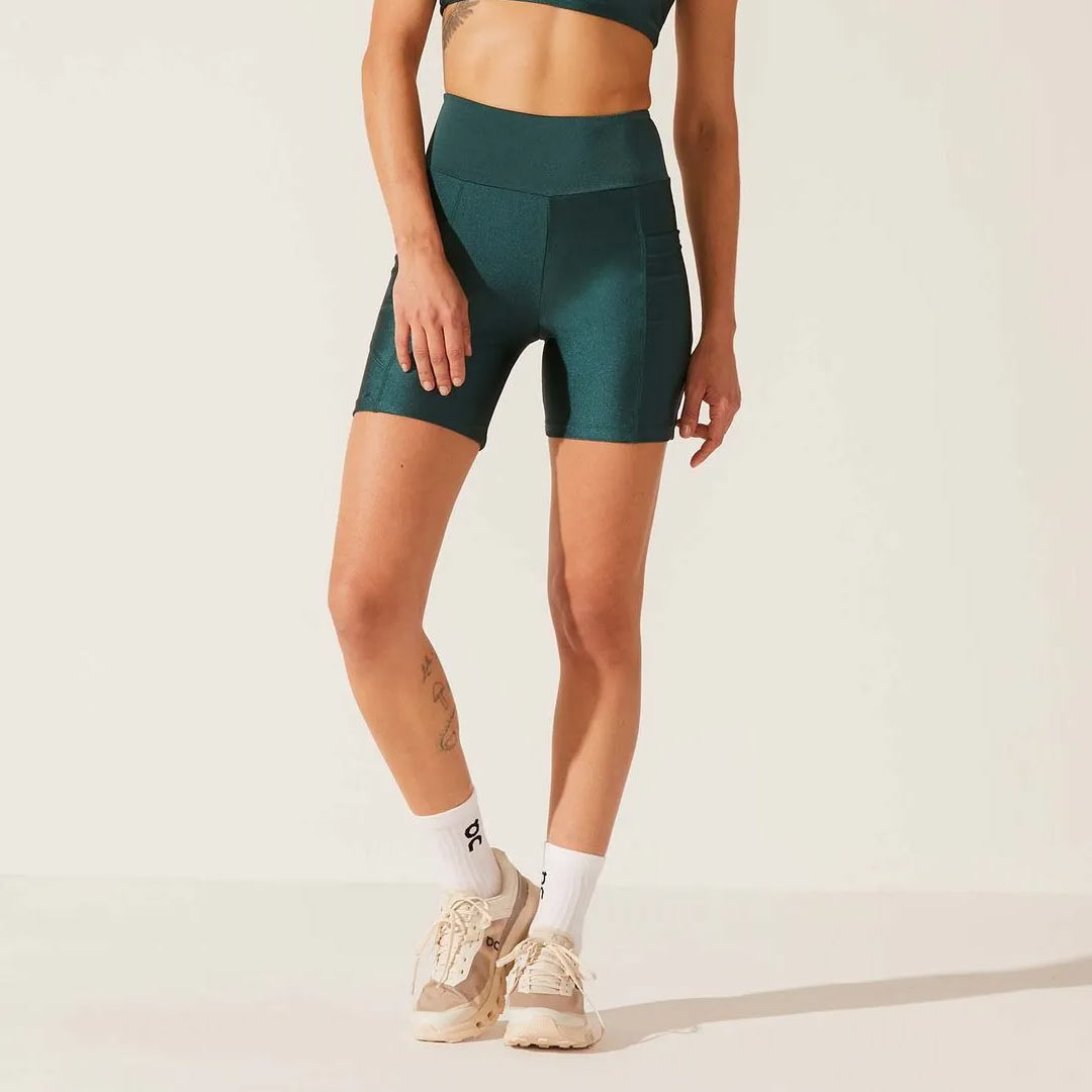 Combinando com o top, o shorts com bolsos Angel tem tecido brilhante, média compressão e malha de poliamida e elastano. A cintura é alta e tem recortes frente, costas e laterais, com bolso embutido.