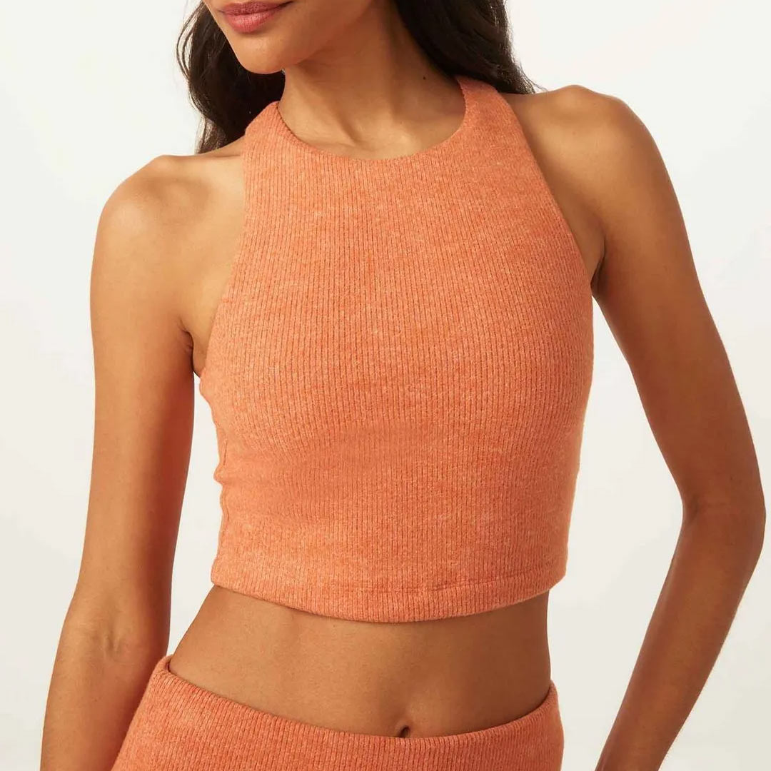 Top de baixa compressão confeccionado em malha canelada que combina maciez e leveza com um toque gostoso flanelado. Modelo nadador, com forro do próprio tecido frente e costas. Decote redondo. Cavas e decote com elástico embutido.