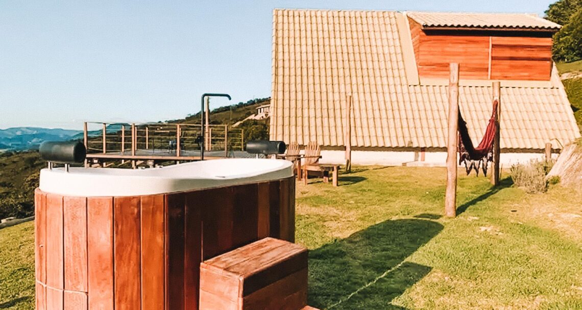 A Cabana Indaiá é ideal para quem quer se desconectar da correria e estar imerso na natureza, com uma vista incrível das montanhas da Serra da Mantiqueira. Por dentro, o ambiente é super aconchegante: a lareira aquece o espaço, o mezanino tem uma cama king confortável com enxoval completo, há um sofá-cama e uma poltrona para relaxar, banheiro com toalhas e roupões macios, e a cozinha é completa, equipada com geladeira, cooktop, forno elétrico e utensílios para preparar suas refeições. Lá fora, conte com um deck de madeira amplo, redes de balanço, mesinha, churrasqueira, espaço para fogo de chão e até ofurô de hidromassagem. Diárias desde R$ 825.